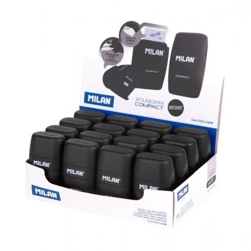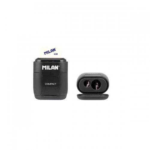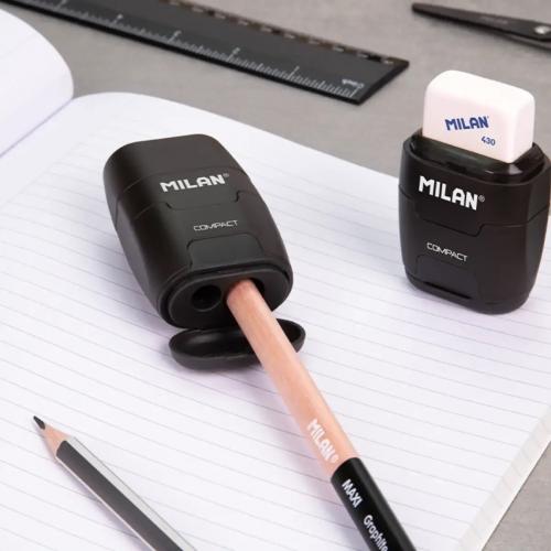 Dzēšgumijas un dubultā zīmuļu asināmā (standarta un MAXI izmēri) kombinācija ar depozītu. KOMPAKTS dizains, Shadow speciālā sērija. Mīksta sintētiskā gumijas kvadrātveida dzēšgumija. Zīmuļu asināmajam ir ass un izturīgs tērauda asmens, kas padara to ideāli piemērotu visu veidu zīmuļiem. Drošības asmeņu sistēma, kas neļauj asmenim atvienoties no zīmuļu asināmā korpusa. Oriģinālu dizainu radījusi MILAN pētniecības un attīstības nodaļa. Pieejamas 430 rezerves dzēšgumijas.