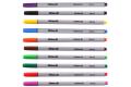 Flomasteri ar 2 dažādiem galiem; Ar smalku un konisku galu; Smalks gals ideāli piemērots skicēšanai; Konusveida uzgalis ideāli piemērots iekrāsošanai; 10 spilgtas krāsas; Ar ventilējamu vāciņu; Ūdens bāzes krāsas; Mazgājams no vairuma tekstilizstrādājumu; Līnijas platums: 1mm un 2mm; Krāsas: dzeltena, oranža, sarkana, violeta, gaiši zila, tumši zila, gaiši zaļa, tumši zaļa, brūna, melna